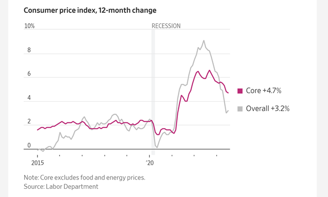This week’s CPI report data was in line with market forecasts and consensus views, but core CPI continues to be quite sticky. While overall CPI is down to 3.2%, core is still quite elevated at 4.7% and is driving fears that the Federal Reserve will have to maintain a tightening bias longer and higher than expected.