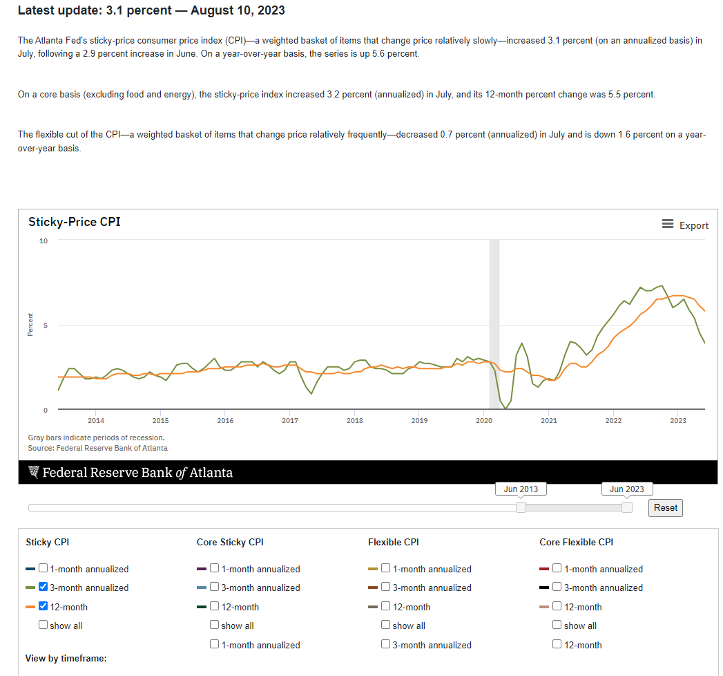 In chart 5, the Atlanta Fed actually has an index called the The Atlanta Fed Sticky CPI Index, which allows you to change the time frame and type of CPI used in the analysis. The box on the bottom of the chart shows these options. On a core basis, excluding food and energy, the sticky price index increased 3.2% in July and the 12-month change was 5.5%. This 12-month change will keep the Fed on a more hawkish watch going forward, as their fear is that if they begin easing too early, it will allow for the next wave of inflation to dig in, a la 1970s.