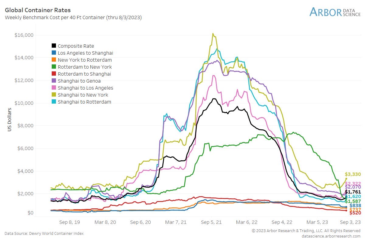 Chart 8 shows the global container-rate market, and just like the previous two charts, the rates are significantly lower than the 2021 highs.